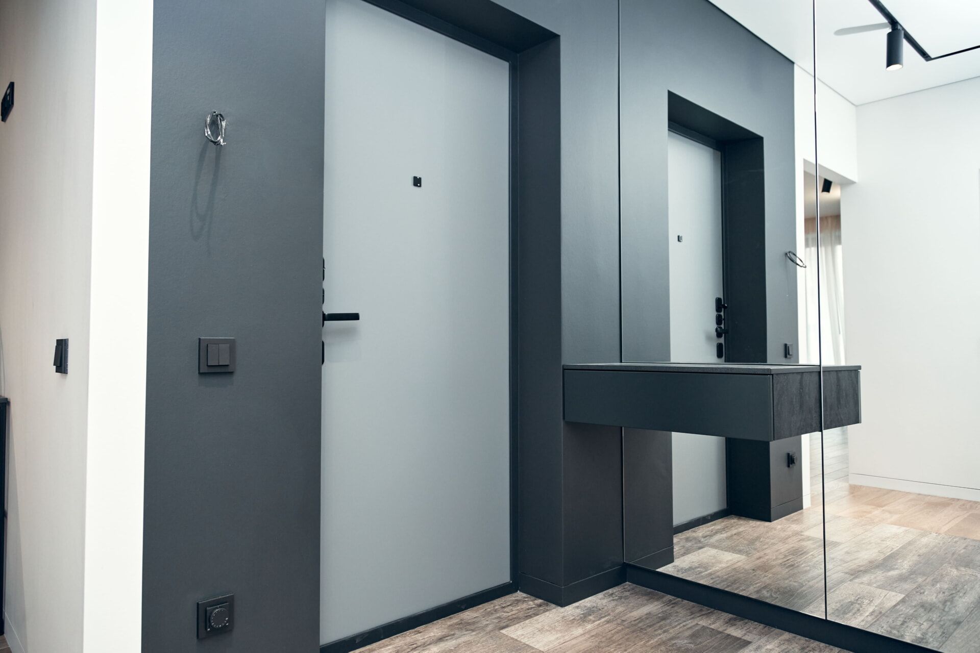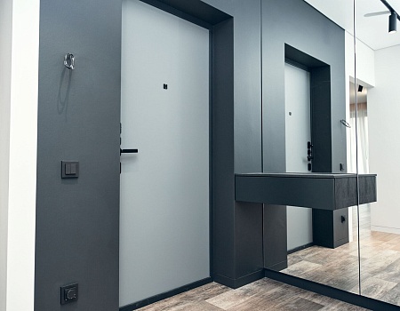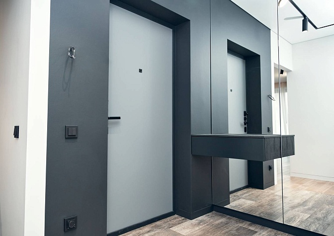 Заменили входную дверь от застройщика на новую от компании «Гардиан» с накладкой в сером оттенке и чёрной фурнитурой. Также оформили входную группу и окрасили ее в глубокий, чёрный оттенок. Одну из стен полностью облицевали зеркалами, установили навесную консоль и большой, распашной шкаф, в который спрятали электрический щит.