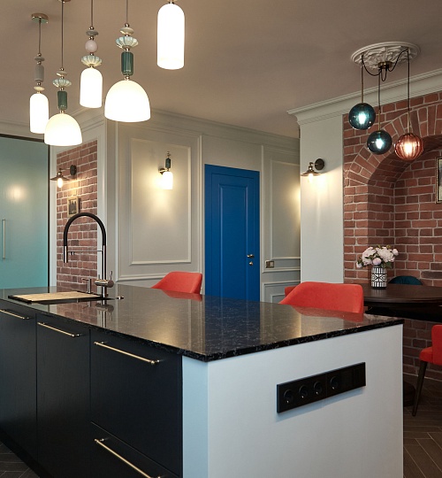 Цветной модернизм, золото и царский кирпич: необычный ремонт в стиле эклектика по нашему дизайн-проекту.